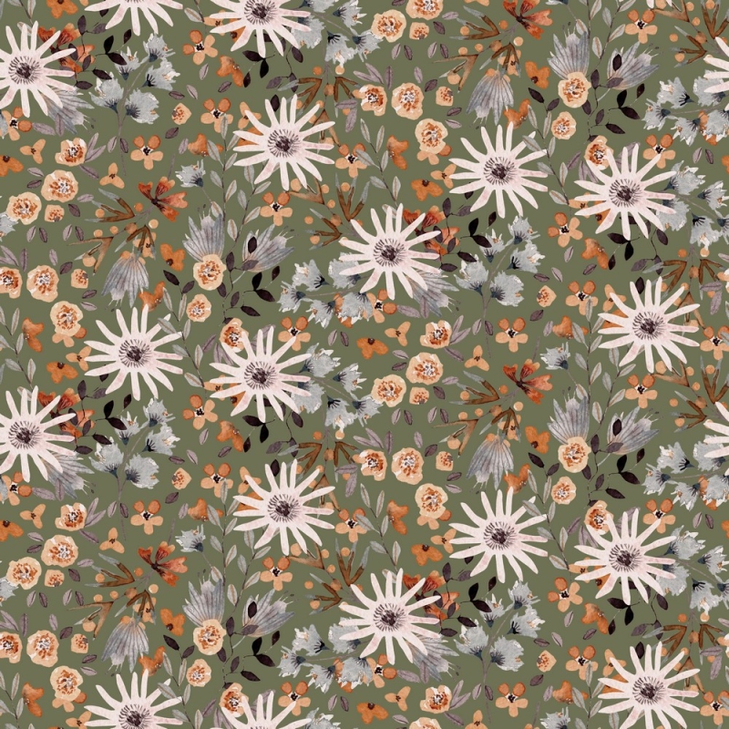 Legergroene sweat digitaal bedruk met vrolijke bloemen. Heerlijke stof voor sweaters, hoodies en jurkjes die lekker warm en zacht van binnen is.