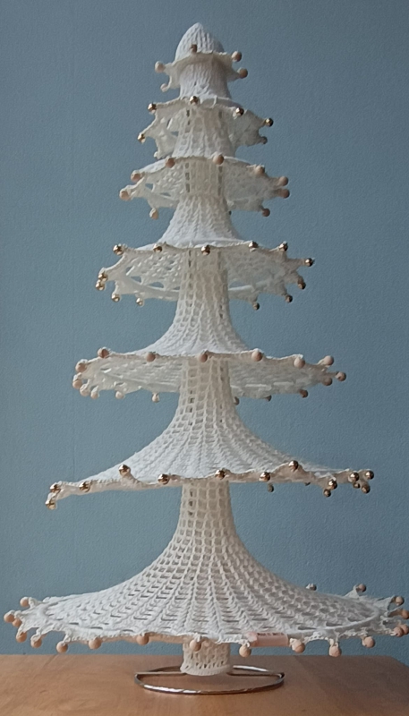 Het begon met een eigen verfijndere variatie op de kerstboom. Ze voegde hier een variatie op de steken,mooie schulprandjes met een glimmertje en kraaltjes aan toe.