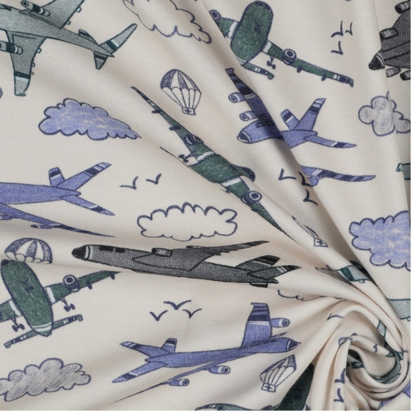 Creme met blauwe vliegtuigen tricot. Maak er een leuk shirt van voor de echte vliegtuig spotter.